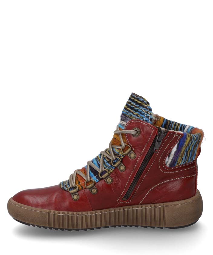 Entdecke die Maren 06, eine Stiefelette, die durch ihren einzigartigen Look besticht. Die Kombination aus glattem, rotem Leder und einem bunten Strickkragen verleiht diesem Schuh einen unverwechselbaren Charakter. Die dekorativen Schnürsenkel und die hellbraune, geriffelte Sohle runden das moderne Design ab.