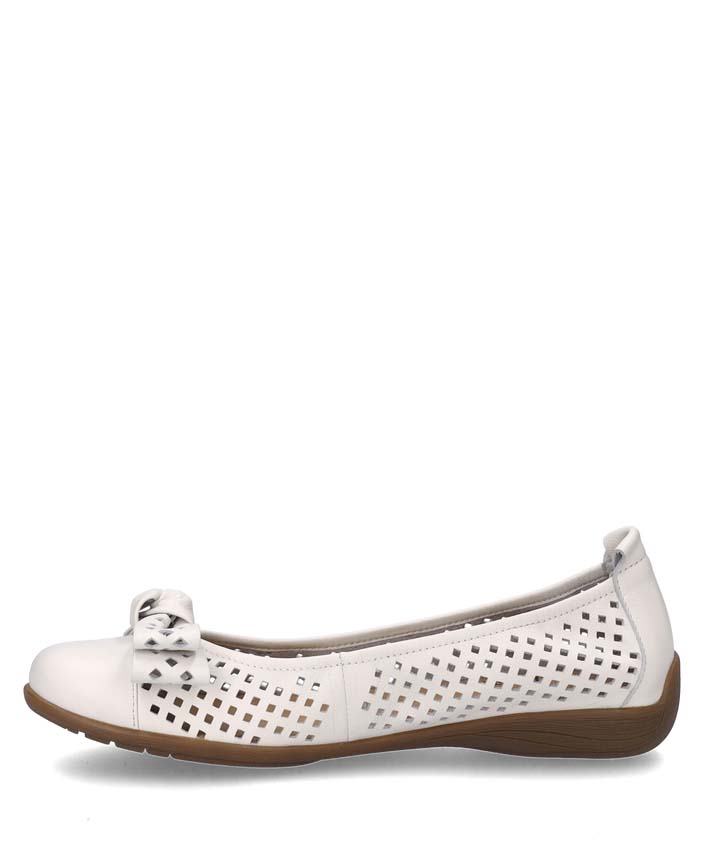 Das durchbrochene Muster des Obermaterials sorgt für ein atmungsaktives Tragegefühl, ideal für warme Tage. Die dekorative Schleife auf der Vorderseite setzt einen stilvollen Akzent und macht den Ballerina zu einem echten Hingucker.